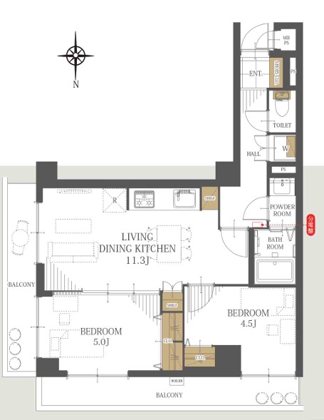 | 間取り/間取り詳細 | 2LDK / LDK11.3帖 / 洋室5.0帖 / 洋室4.5帖 | ||